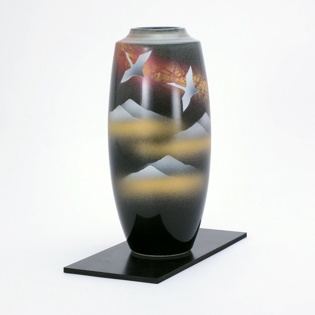 日本九谷燒陶瓷花樽 (雙鶴連山) (日本製)
