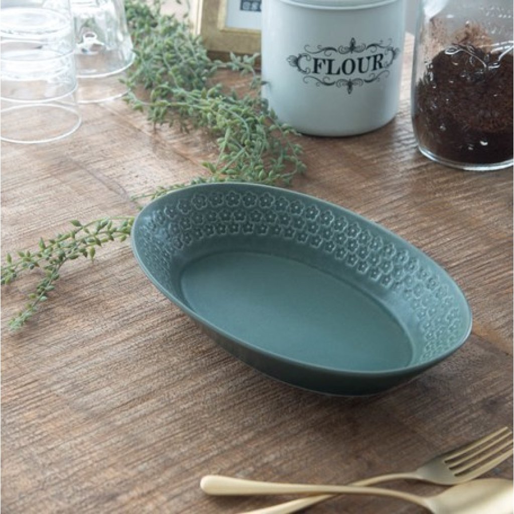 日本美濃燒壓花啞光橢圓碟 (綠色) 26.5CM (日本製)