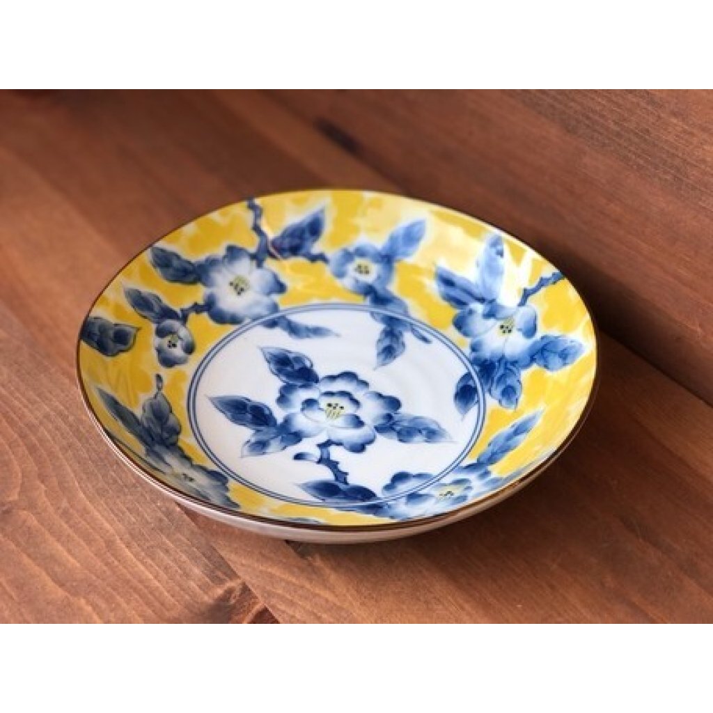 日式陶瓷黄彩花紋瓦碟 21CM (日本製)
