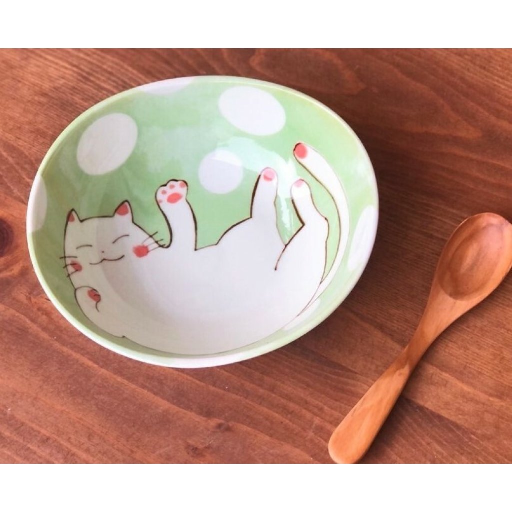 日式陶瓷綠色貓貓瓦碗 14CM (日本製)