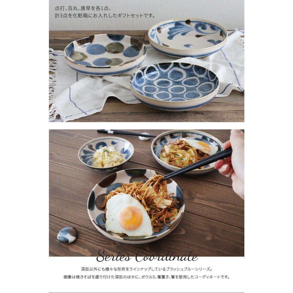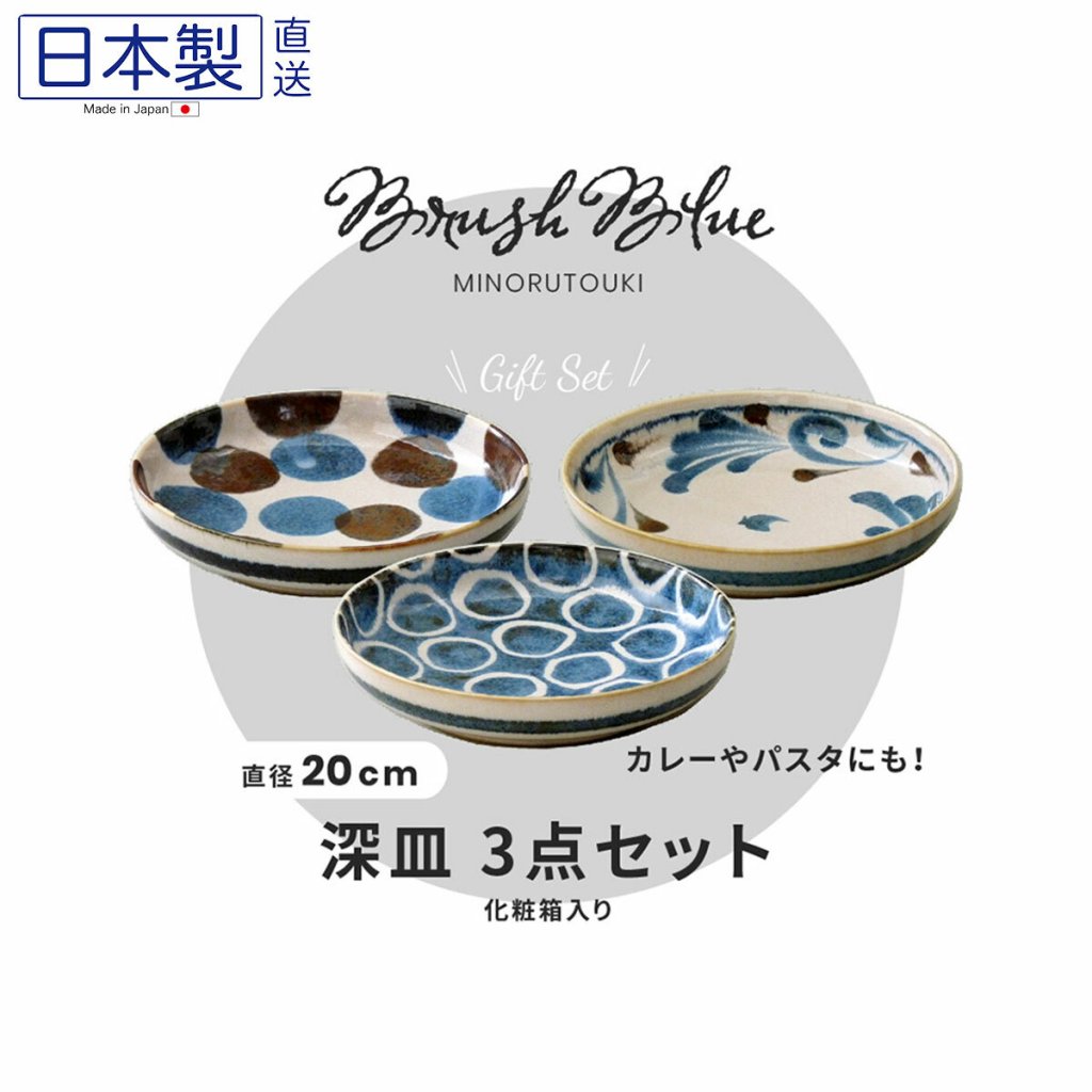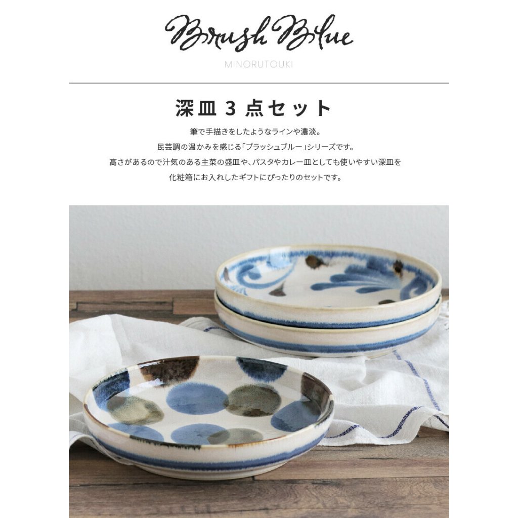 日本美濃燒Brush Blue筆青瓦碟套裝 20CM (3枚入) (日本製)