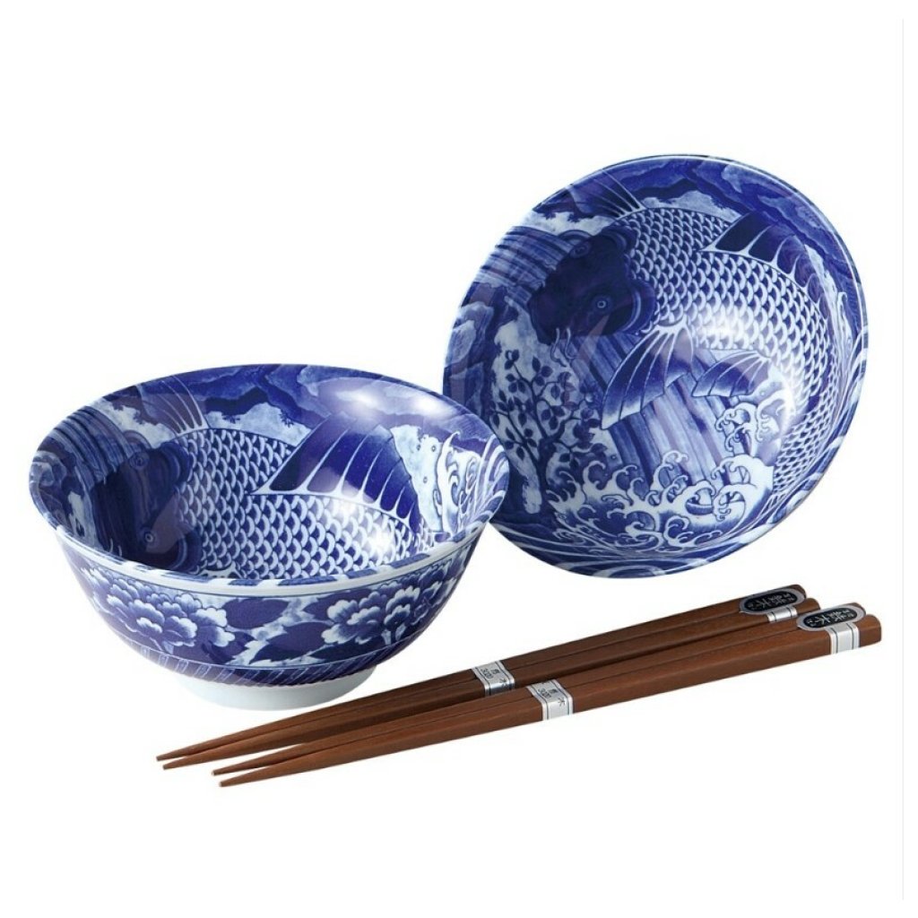 日本美濃燒陶瓷鯉青瓦碗連筷子套裝 (日本製)