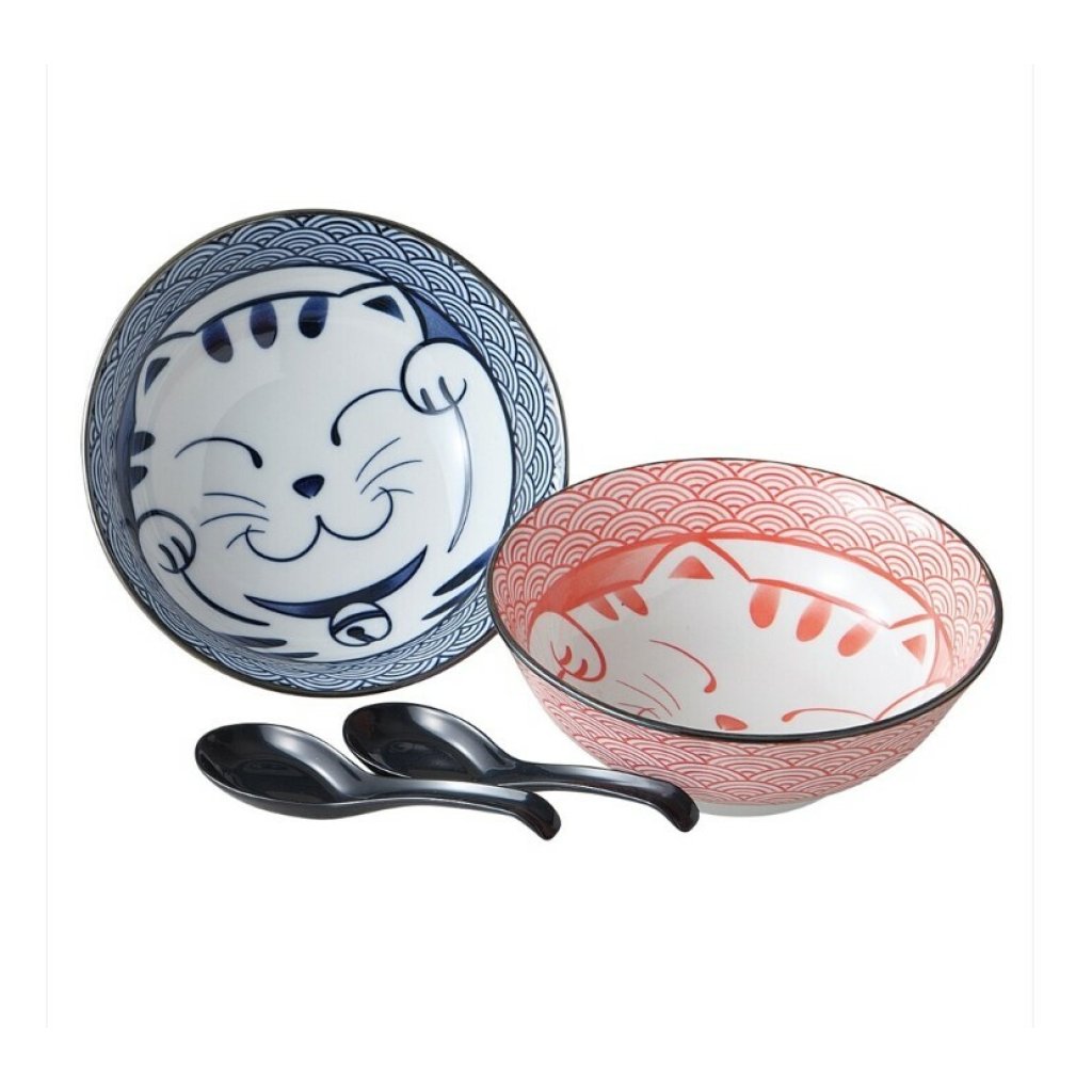 日本美濃燒陶瓷青海波貓貓麺鉢瓦碗連匙羹套裝 (日本製)