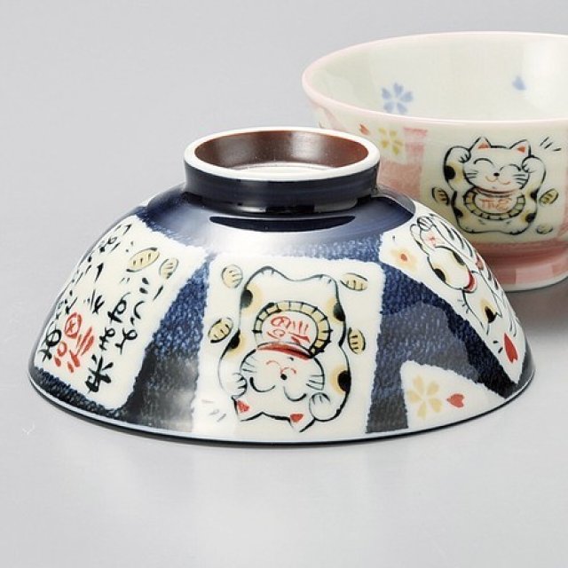 日式陶瓷招財貓瓦碗(藍色) 12CM (日本製)