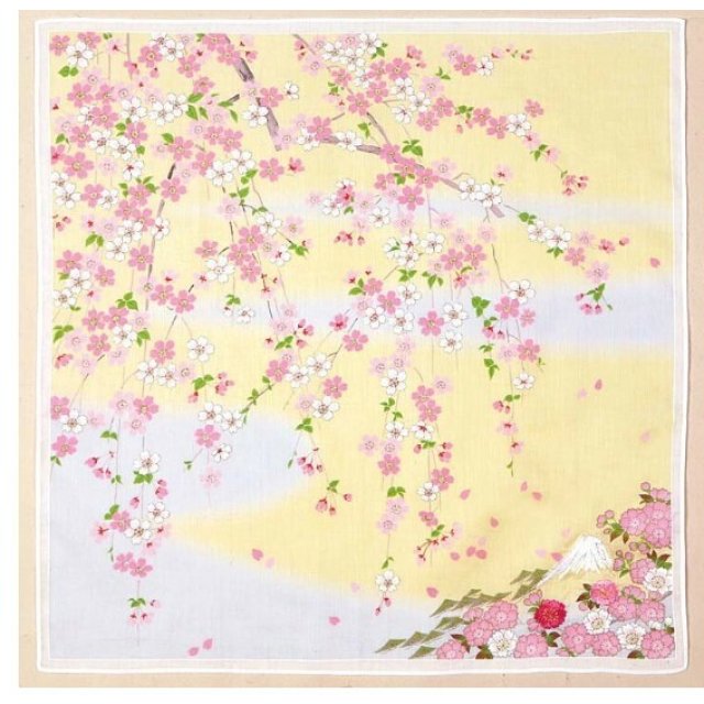 日本友禪刺繍櫻花富士山紗布方巾 (粉黃) 45x45 (日本製)