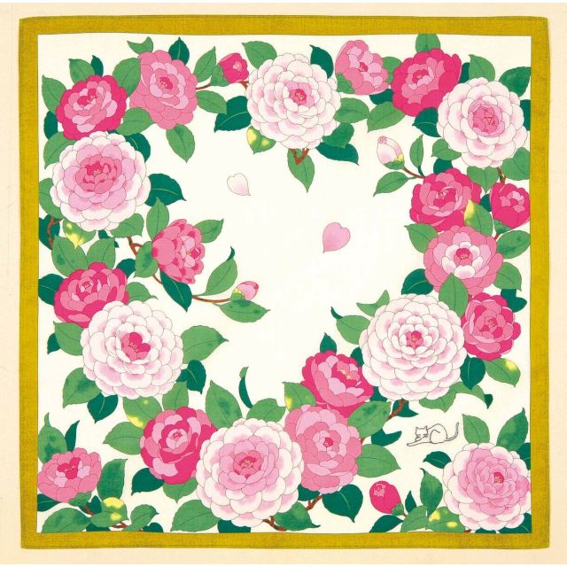 日本en.gawa刺繍乙女椿花紗布方巾 (金色) 45x45 (日本製)