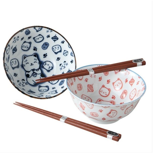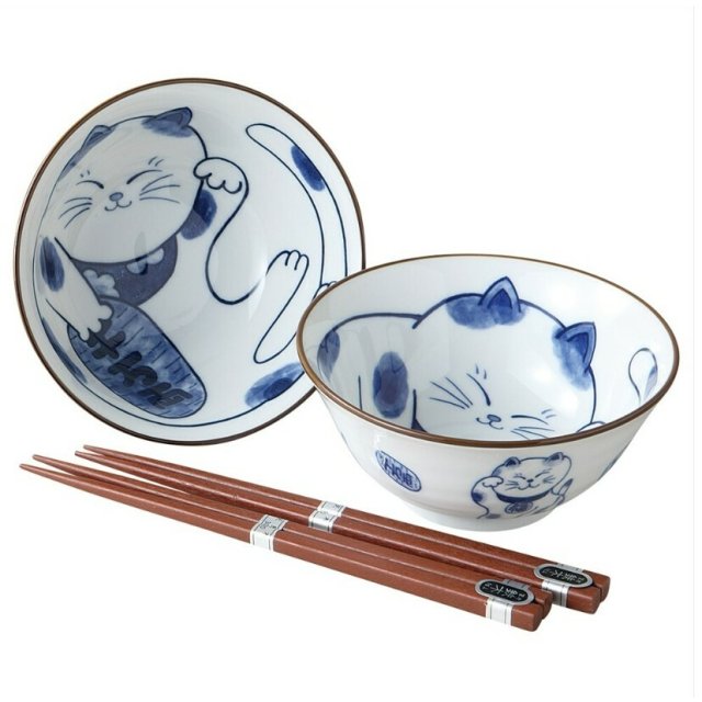 日本美濃燒陶瓷許願貓貓瓦碗連筷子套裝 (日本製)