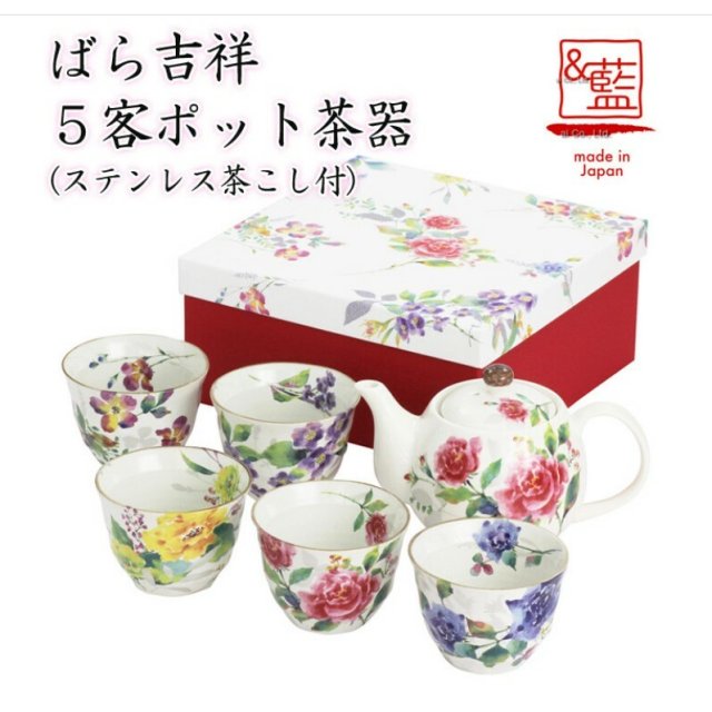 日本美濃燒茶壺套裝(玫瑰吉祥)(5件套) (日本製)