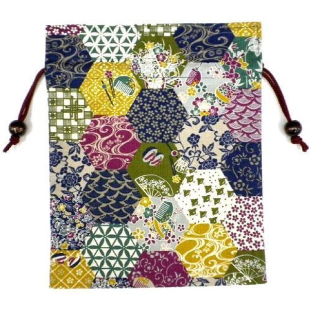 日式花卉圖案索繩袋 (綠色) (日本製)