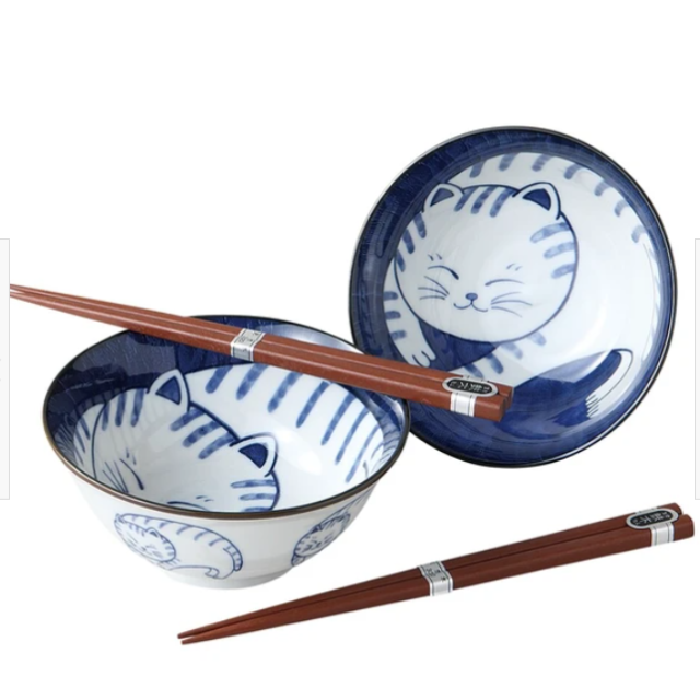 日本美濃燒陶瓷貓貓瓦碗連筷子套裝 (日本製)