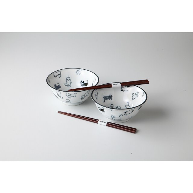 日本美濃燒散貓貓瓦碗連筷子套裝15CM (日本製)