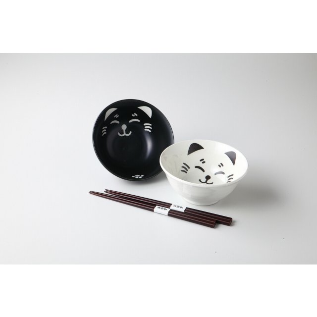 日本美濃燒黑白貓瓦碗連筷子套裝15CM (日本製)