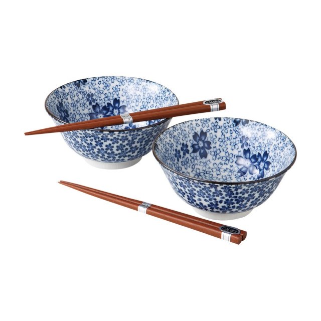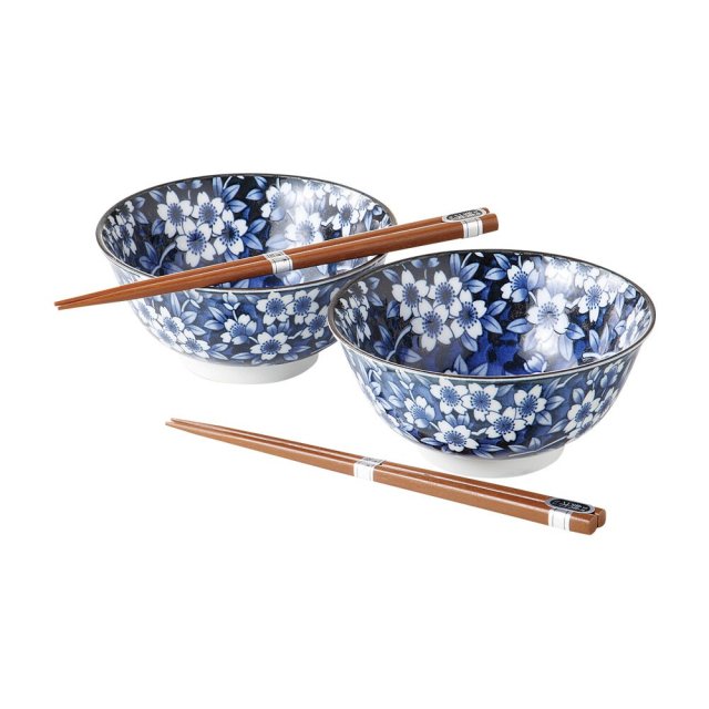 日本美濃燒陶瓷藍櫻花瓦碗連筷子套裝 (日本製)