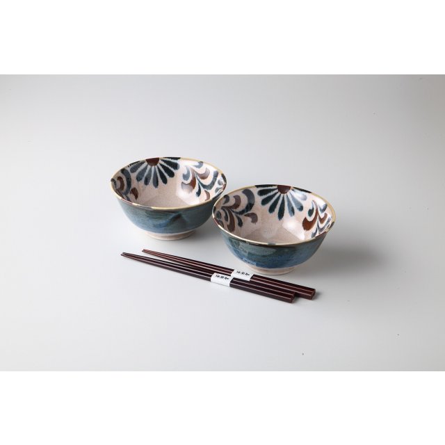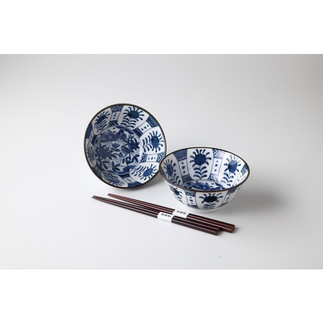 日本美濃燒陶瓷草花瓦碗連筷子套裝 (日本製)